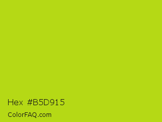 Hex #b5d915 Color is a normal lime color and the nearest color is Inch Worm #b0e313. Hex code #b5d915 and RGB value is rgb(181,217,21). In RGB color space, this color is composed of 71% red, 85% green, 8% blue, In CMYK color space, this color is composed of 17% cyan, 0% magenta, 90% yellow , 15% black , In HSL color space, this color has a hue angle of 71° , 82% saturation and 47% lightness.