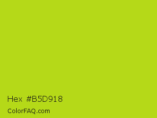 Hex #b5d918 Color is a normal lime color and the nearest color is Inch Worm #b0e313. Hex code #b5d918 and RGB value is rgb(181,217,24). In RGB color space, this color is composed of 71% red, 85% green, 9% blue, In CMYK color space, this color is composed of 17% cyan, 0% magenta, 89% yellow , 15% black , In HSL color space, this color has a hue angle of 71° , 80% saturation and 47% lightness.