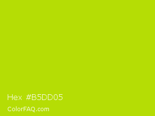 Hex #b5dd05 Color is a normal lime color and the nearest color is Fuego #bede0d. Hex code #b5dd05 and RGB value is rgb(181,221,5). In RGB color space, this color is composed of 71% red, 87% green, 2% blue, In CMYK color space, this color is composed of 18% cyan, 0% magenta, 98% yellow , 13% black , In HSL color space, this color has a hue angle of 71° , 96% saturation and 44% lightness.