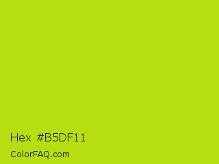 Hex #b5df11 Color is a normal lime color and the nearest color is Inch Worm #b0e313. Hex code #b5df11 and RGB value is rgb(181,223,17). In RGB color space, this color is composed of 71% red, 87% green, 7% blue, In CMYK color space, this color is composed of 19% cyan, 0% magenta, 92% yellow , 13% black , In HSL color space, this color has a hue angle of 72° , 86% saturation and 47% lightness.