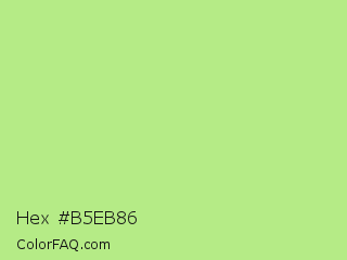 Hex #b5eb86 Color is a light green color and the nearest color is Sulu #c1f07c. Hex code #b5eb86 and RGB value is rgb(181,235,134). In RGB color space, this color is composed of 71% red, 92% green, 53% blue, In CMYK color space, this color is composed of 23% cyan, 0% magenta, 43% yellow , 8% black , In HSL color space, this color has a hue angle of 92° , 72% saturation and 72% lightness.