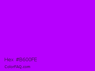 Hex #b600fe Color is a normal purple color and the nearest color is Electric Purple #bf00ff. Hex code #b600fe and RGB value is rgb(182,0,254). In RGB color space, this color is composed of 71% red, 0% green, 100% blue, In CMYK color space, this color is composed of 28% cyan, 100% magenta, 0% yellow , 0% black , In HSL color space, this color has a hue angle of 283° , 100% saturation and 50% lightness.