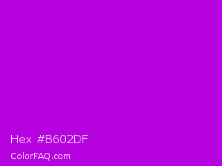 Hex #b602df Color is a normal purple color and the nearest color is Vivid Mulberry #b80ce3. Hex code #b602df and RGB value is rgb(182,2,223). In RGB color space, this color is composed of 71% red, 1% green, 87% blue, In CMYK color space, this color is composed of 18% cyan, 99% magenta, 0% yellow , 13% black , In HSL color space, this color has a hue angle of 289° , 98% saturation and 44% lightness.