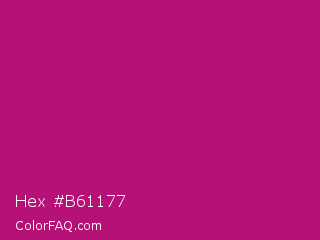 Hex #b61177 Color is a normal magenta color and the nearest color is Red Violet #c71585. Hex code #b61177 and RGB value is rgb(182,17,119). In RGB color space, this color is composed of 71% red, 7% green, 47% blue, In CMYK color space, this color is composed of 0% cyan, 91% magenta, 35% yellow , 29% black , In HSL color space, this color has a hue angle of 323° , 83% saturation and 39% lightness.