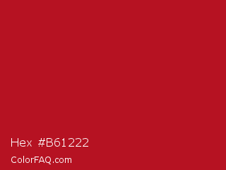 Hex #b61222 Color is a normal red color and the nearest color is Carnelian #b31b1b. Hex code #b61222 and RGB value is rgb(182,18,34). In RGB color space, this color is composed of 71% red, 7% green, 13% blue, In CMYK color space, this color is composed of 0% cyan, 90% magenta, 81% yellow , 29% black , In HSL color space, this color has a hue angle of 354° , 82% saturation and 39% lightness.