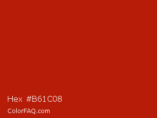 Hex #b61c08 Color is a normal red color and the nearest color is International Orange Engineering #ba160c. Hex code #b61c08 and RGB value is rgb(182,28,8). In RGB color space, this color is composed of 71% red, 11% green, 3% blue, In CMYK color space, this color is composed of 0% cyan, 85% magenta, 96% yellow , 29% black , In HSL color space, this color has a hue angle of 7° , 92% saturation and 37% lightness.