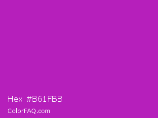 Hex #b61fbb Color is a normal magenta color and the nearest color is Byzantine #bd33a4. Hex code #b61fbb and RGB value is rgb(182,31,187). In RGB color space, this color is composed of 71% red, 12% green, 73% blue, In CMYK color space, this color is composed of 3% cyan, 83% magenta, 0% yellow , 27% black , In HSL color space, this color has a hue angle of 298° , 72% saturation and 43% lightness.