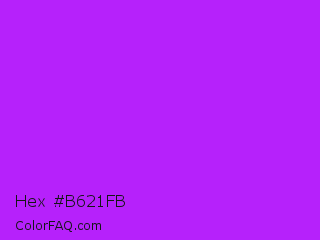 Hex #b621fb Color is a normal purple color and the nearest color is Veronica #a020f0. Hex code #b621fb and RGB value is rgb(182,33,251). In RGB color space, this color is composed of 71% red, 13% green, 98% blue, In CMYK color space, this color is composed of 27% cyan, 87% magenta, 0% yellow , 2% black , In HSL color space, this color has a hue angle of 281° , 96% saturation and 56% lightness.