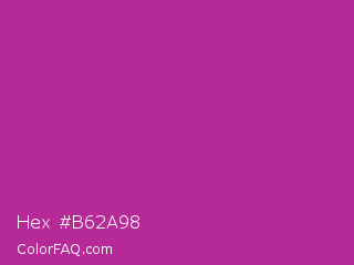 Hex #b62a98 Color is a normal magenta color and the nearest color is Byzantine #bd33a4. Hex code #b62a98 and RGB value is rgb(182,42,152). In RGB color space, this color is composed of 71% red, 16% green, 60% blue, In CMYK color space, this color is composed of 0% cyan, 77% magenta, 16% yellow , 29% black , In HSL color space, this color has a hue angle of 313° , 63% saturation and 44% lightness.