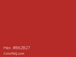 Hex #b62b27 Color is a normal red color and the nearest color is Tall Poppy #b32d29. Hex code #b62b27 and RGB value is rgb(182,43,39). In RGB color space, this color is composed of 71% red, 17% green, 15% blue, In CMYK color space, this color is composed of 0% cyan, 76% magenta, 79% yellow , 29% black , In HSL color space, this color has a hue angle of 2° , 65% saturation and 43% lightness.