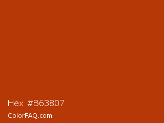 Hex #b63807 Color is a normal orange color and the nearest color is Rust #b7410e. Hex code #b63807 and RGB value is rgb(182,56,7). In RGB color space, this color is composed of 71% red, 22% green, 3% blue, In CMYK color space, this color is composed of 0% cyan, 69% magenta, 96% yellow , 29% black , In HSL color space, this color has a hue angle of 17° , 93% saturation and 37% lightness.