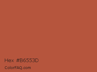 Hex #b6553d Color is a normal red color and the nearest color is Crail #b95140. Hex code #b6553d and RGB value is rgb(182,85,61). In RGB color space, this color is composed of 71% red, 33% green, 24% blue, In CMYK color space, this color is composed of 0% cyan, 53% magenta, 66% yellow , 29% black , In HSL color space, this color has a hue angle of 12° , 50% saturation and 48% lightness.