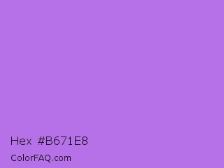 Hex #b671e8 Color is a light purple color and the nearest color is Lavender #b57edc. Hex code #b671e8 and RGB value is rgb(182,113,232). In RGB color space, this color is composed of 71% red, 44% green, 91% blue, In CMYK color space, this color is composed of 22% cyan, 51% magenta, 0% yellow , 9% black , In HSL color space, this color has a hue angle of 275° , 72% saturation and 68% lightness.