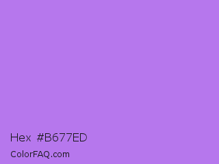 Hex #b677ed Color is a light purple color and the nearest color is Lavender #b57edc. Hex code #b677ed and RGB value is rgb(182,119,237). In RGB color space, this color is composed of 71% red, 47% green, 93% blue, In CMYK color space, this color is composed of 23% cyan, 50% magenta, 0% yellow , 7% black , In HSL color space, this color has a hue angle of 272° , 77% saturation and 70% lightness.