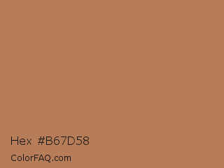 Hex #b67d58 Color is a normal orange color and the nearest color is Deer #ba8759. Hex code #b67d58 and RGB value is rgb(182,125,88). In RGB color space, this color is composed of 71% red, 49% green, 35% blue, In CMYK color space, this color is composed of 0% cyan, 31% magenta, 52% yellow , 29% black , In HSL color space, this color has a hue angle of 24° , 39% saturation and 53% lightness.