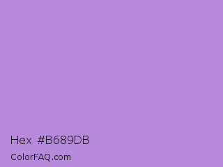 Hex #b689db Color is a light purple color and the nearest color is Lavender #b57edc. Hex code #b689db and RGB value is rgb(182,137,219). In RGB color space, this color is composed of 71% red, 54% green, 86% blue, In CMYK color space, this color is composed of 17% cyan, 37% magenta, 0% yellow , 14% black , In HSL color space, this color has a hue angle of 273° , 53% saturation and 70% lightness.