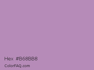 Hex #b68bb8 Color is a light magenta color and the nearest color is African Violet #b284be. Hex code #b68bb8 and RGB value is rgb(182,139,184). In RGB color space, this color is composed of 71% red, 55% green, 72% blue, In CMYK color space, this color is composed of 1% cyan, 24% magenta, 0% yellow , 28% black , In HSL color space, this color has a hue angle of 297° , 24% saturation and 63% lightness.