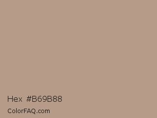 Hex #b69b88 Color is a light orange color and the nearest color is Quicksand #bd978e. Hex code #b69b88 and RGB value is rgb(182,155,136). In RGB color space, this color is composed of 71% red, 61% green, 53% blue, In CMYK color space, this color is composed of 0% cyan, 15% magenta, 25% yellow , 29% black , In HSL color space, this color has a hue angle of 25° , 24% saturation and 62% lightness.