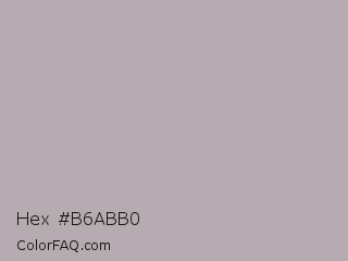 Hex #b6abb0 Color is a light rose color and the nearest color is Nobel #b7b1b1. Hex code #b6abb0 and RGB value is rgb(182,171,176). In RGB color space, this color is composed of 71% red, 67% green, 69% blue, In CMYK color space, this color is composed of 0% cyan, 6% magenta, 3% yellow , 29% black , In HSL color space, this color has a hue angle of 333° , 7% saturation and 69% lightness.