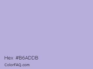 Hex #b6addb Color is a light indigo color and the nearest color is Maximum Blue Purple #acace6. Hex code #b6addb and RGB value is rgb(182,173,219). In RGB color space, this color is composed of 71% red, 68% green, 86% blue, In CMYK color space, this color is composed of 17% cyan, 21% magenta, 0% yellow , 14% black , In HSL color space, this color has a hue angle of 252° , 39% saturation and 77% lightness.