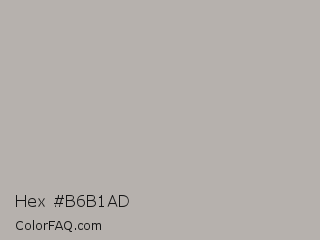 Hex #b6b1ad Color is a light orange color and the nearest color is Nobel #b7b1b1. Hex code #b6b1ad and RGB value is rgb(182,177,173). In RGB color space, this color is composed of 71% red, 69% green, 68% blue, In CMYK color space, this color is composed of 0% cyan, 3% magenta, 5% yellow , 29% black , In HSL color space, this color has a hue angle of 27° , 6% saturation and 70% lightness.