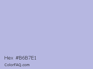 Hex #b6b7e1 Color is a light blue color and the nearest color is Pigeon Post #afbdd9. Hex code #b6b7e1 and RGB value is rgb(182,183,225). In RGB color space, this color is composed of 71% red, 72% green, 88% blue, In CMYK color space, this color is composed of 19% cyan, 19% magenta, 0% yellow , 12% black , In HSL color space, this color has a hue angle of 239° , 42% saturation and 80% lightness.