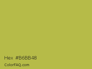 Hex #b6bb48 Color is a normal yellow color and the nearest color is Turmeric #cabb48. Hex code #b6bb48 and RGB value is rgb(182,187,72). In RGB color space, this color is composed of 71% red, 73% green, 28% blue, In CMYK color space, this color is composed of 3% cyan, 0% magenta, 61% yellow , 27% black , In HSL color space, this color has a hue angle of 63° , 46% saturation and 51% lightness.