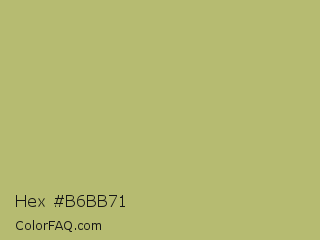 Hex #b6bb71 Color is a normal yellow color and the nearest color is Gimblet #b8b56a. Hex code #b6bb71 and RGB value is rgb(182,187,113). In RGB color space, this color is composed of 71% red, 73% green, 44% blue, In CMYK color space, this color is composed of 3% cyan, 0% magenta, 40% yellow , 27% black , In HSL color space, this color has a hue angle of 64° , 35% saturation and 59% lightness.