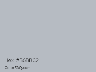 Hex #b6bbc2 Color is a light blue color and the nearest color is French Gray #bdbdc6. Hex code #b6bbc2 and RGB value is rgb(182,187,194). In RGB color space, this color is composed of 71% red, 73% green, 76% blue, In CMYK color space, this color is composed of 6% cyan, 4% magenta, 0% yellow , 24% black , In HSL color space, this color has a hue angle of 215° , 9% saturation and 74% lightness.