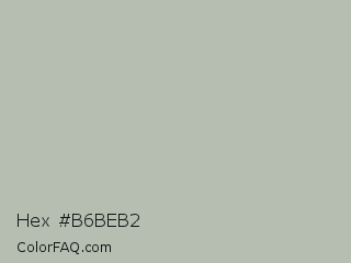 Hex #b6beb2 Color is a light green color and the nearest color is Green Spring #b8c1b1. Hex code #b6beb2 and RGB value is rgb(182,190,178). In RGB color space, this color is composed of 71% red, 75% green, 70% blue, In CMYK color space, this color is composed of 4% cyan, 0% magenta, 6% yellow , 25% black , In HSL color space, this color has a hue angle of 100° , 8% saturation and 72% lightness.