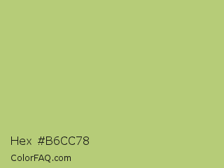 Hex #b6cc78 Color is a light lime color and the nearest color is Wild Willow #b9c46a. Hex code #b6cc78 and RGB value is rgb(182,204,120). In RGB color space, this color is composed of 71% red, 80% green, 47% blue, In CMYK color space, this color is composed of 11% cyan, 0% magenta, 41% yellow , 20% black , In HSL color space, this color has a hue angle of 76° , 45% saturation and 64% lightness.