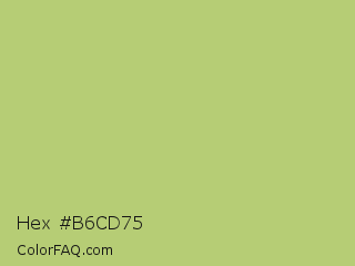 Hex #b6cd75 Color is a light lime color and the nearest color is Wild Willow #b9c46a. Hex code #b6cd75 and RGB value is rgb(182,205,117). In RGB color space, this color is composed of 71% red, 80% green, 46% blue, In CMYK color space, this color is composed of 11% cyan, 0% magenta, 43% yellow , 20% black , In HSL color space, this color has a hue angle of 76° , 47% saturation and 63% lightness.