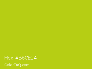 Hex #b6ce14 Color is a normal yellow color and the nearest color is Rio Grande #bbd009. Hex code #b6ce14 and RGB value is rgb(182,206,20). In RGB color space, this color is composed of 71% red, 81% green, 8% blue, In CMYK color space, this color is composed of 12% cyan, 0% magenta, 90% yellow , 19% black , In HSL color space, this color has a hue angle of 68° , 82% saturation and 44% lightness.
