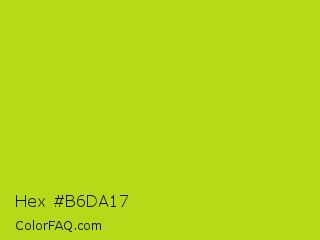 Hex #b6da17 Color is a normal lime color and the nearest color is Inch Worm #b0e313. Hex code #b6da17 and RGB value is rgb(182,218,23). In RGB color space, this color is composed of 71% red, 85% green, 9% blue, In CMYK color space, this color is composed of 17% cyan, 0% magenta, 89% yellow , 15% black , In HSL color space, this color has a hue angle of 71° , 81% saturation and 47% lightness.