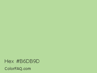 Hex #b6db9d Color is a light green color and the nearest color is Granny Smith Apple #a8e4a0. Hex code #b6db9d and RGB value is rgb(182,219,157). In RGB color space, this color is composed of 71% red, 86% green, 62% blue, In CMYK color space, this color is composed of 17% cyan, 0% magenta, 28% yellow , 14% black , In HSL color space, this color has a hue angle of 96° , 46% saturation and 74% lightness.