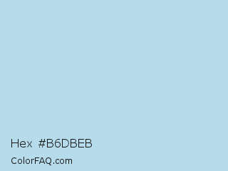 Hex #b6dbeb Color is a very light blue color and the nearest color is Powder Blue #b0e0e6. Hex code #b6dbeb and RGB value is rgb(182,219,235). In RGB color space, this color is composed of 71% red, 86% green, 92% blue, In CMYK color space, this color is composed of 23% cyan, 7% magenta, 0% yellow , 8% black , In HSL color space, this color has a hue angle of 198° , 57% saturation and 82% lightness.