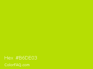 Hex #b6de03 Color is a normal lime color and the nearest color is Fuego #bede0d. Hex code #b6de03 and RGB value is rgb(182,222,3). In RGB color space, this color is composed of 71% red, 87% green, 1% blue, In CMYK color space, this color is composed of 18% cyan, 0% magenta, 99% yellow , 13% black , In HSL color space, this color has a hue angle of 71° , 97% saturation and 44% lightness.