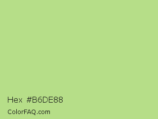 Hex #b6de88 Color is a light green color and the nearest color is Medium Spring Bud #c9dc87. Hex code #b6de88 and RGB value is rgb(182,222,136). In RGB color space, this color is composed of 71% red, 87% green, 53% blue, In CMYK color space, this color is composed of 18% cyan, 0% magenta, 39% yellow , 13% black , In HSL color space, this color has a hue angle of 88° , 57% saturation and 70% lightness.