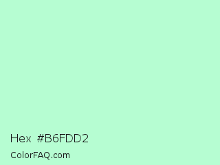 Hex #b6fdd2 Color is a very light green color and the nearest color is Magic Mint #aaf0d1. Hex code #b6fdd2 and RGB value is rgb(182,253,210). In RGB color space, this color is composed of 71% red, 99% green, 82% blue, In CMYK color space, this color is composed of 28% cyan, 0% magenta, 17% yellow , 1% black , In HSL color space, this color has a hue angle of 144° , 95% saturation and 85% lightness.