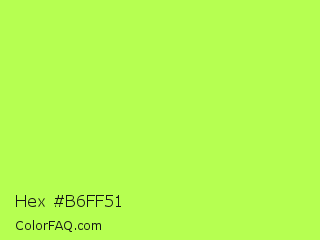 Hex #b6ff51 Color is a light green color and the nearest color is Inchworm #b2ec5d. Hex code #b6ff51 and RGB value is rgb(182,255,81). In RGB color space, this color is composed of 71% red, 100% green, 32% blue, In CMYK color space, this color is composed of 29% cyan, 0% magenta, 68% yellow , 0% black , In HSL color space, this color has a hue angle of 85° , 100% saturation and 66% lightness.