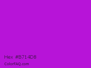 Hex #b714d8 Color is a normal purple color and the nearest color is Vivid Mulberry #b80ce3. Hex code #b714d8 and RGB value is rgb(183,20,216). In RGB color space, this color is composed of 72% red, 8% green, 85% blue, In CMYK color space, this color is composed of 15% cyan, 91% magenta, 0% yellow , 15% black , In HSL color space, this color has a hue angle of 290° , 83% saturation and 46% lightness.