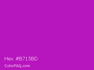 Hex #b715bd Color is a normal magenta color and the nearest color is Heliotrope Magenta #aa00bb. Hex code #b715bd and RGB value is rgb(183,21,189). In RGB color space, this color is composed of 72% red, 8% green, 74% blue, In CMYK color space, this color is composed of 3% cyan, 89% magenta, 0% yellow , 26% black , In HSL color space, this color has a hue angle of 298° , 80% saturation and 41% lightness.