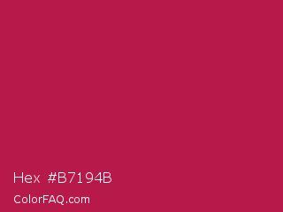 Hex #b7194b Color is a normal rose color and the nearest color is French Wine #ac1e44. Hex code #b7194b and RGB value is rgb(183,25,75). In RGB color space, this color is composed of 72% red, 10% green, 29% blue, In CMYK color space, this color is composed of 0% cyan, 86% magenta, 59% yellow , 28% black , In HSL color space, this color has a hue angle of 341° , 76% saturation and 41% lightness.
