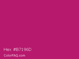 Hex #b7196d Color is a normal rose color and the nearest color is Hibiscus #b6316c. Hex code #b7196d and RGB value is rgb(183,25,109). In RGB color space, this color is composed of 72% red, 10% green, 43% blue, In CMYK color space, this color is composed of 0% cyan, 86% magenta, 40% yellow , 28% black , In HSL color space, this color has a hue angle of 328° , 76% saturation and 41% lightness.