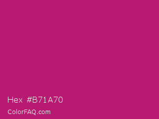 Hex #b71a70 Color is a normal magenta color and the nearest color is Magenta Dye #ca1f7b. Hex code #b71a70 and RGB value is rgb(183,26,112). In RGB color space, this color is composed of 72% red, 10% green, 44% blue, In CMYK color space, this color is composed of 0% cyan, 86% magenta, 39% yellow , 28% black , In HSL color space, this color has a hue angle of 327° , 75% saturation and 41% lightness.