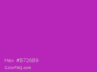 Hex #b726b9 Color is a normal magenta color and the nearest color is Byzantine #bd33a4. Hex code #b726b9 and RGB value is rgb(183,38,185). In RGB color space, this color is composed of 72% red, 15% green, 73% blue, In CMYK color space, this color is composed of 1% cyan, 79% magenta, 0% yellow , 27% black , In HSL color space, this color has a hue angle of 299° , 66% saturation and 44% lightness.