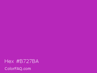 Hex #b727ba Color is a normal magenta color and the nearest color is Byzantine #bd33a4. Hex code #b727ba and RGB value is rgb(183,39,186). In RGB color space, this color is composed of 72% red, 15% green, 73% blue, In CMYK color space, this color is composed of 2% cyan, 79% magenta, 0% yellow , 27% black , In HSL color space, this color has a hue angle of 299° , 65% saturation and 44% lightness.