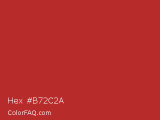 Hex #b72c2a Color is a normal red color and the nearest color is Tall Poppy #b32d29. Hex code #b72c2a and RGB value is rgb(183,44,42). In RGB color space, this color is composed of 72% red, 17% green, 16% blue, In CMYK color space, this color is composed of 0% cyan, 76% magenta, 77% yellow , 28% black , In HSL color space, this color has a hue angle of 1° , 63% saturation and 44% lightness.