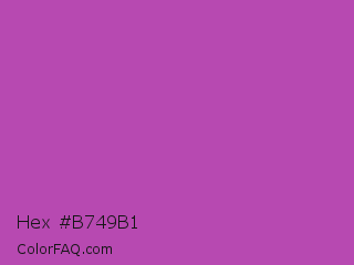 Hex #b749b1 Color is a normal magenta color and the nearest color is Fuchsia Pink #c154c1. Hex code #b749b1 and RGB value is rgb(183,73,177). In RGB color space, this color is composed of 72% red, 29% green, 69% blue, In CMYK color space, this color is composed of 0% cyan, 60% magenta, 3% yellow , 28% black , In HSL color space, this color has a hue angle of 303° , 43% saturation and 50% lightness.