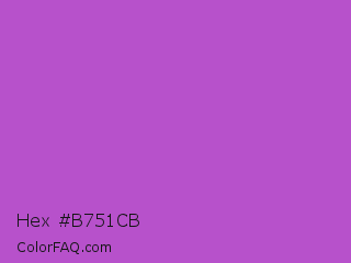 Hex #b751cb Color is a normal purple color and the nearest color is Medium Orchid #ba55d3. Hex code #b751cb and RGB value is rgb(183,81,203). In RGB color space, this color is composed of 72% red, 32% green, 80% blue, In CMYK color space, this color is composed of 10% cyan, 60% magenta, 0% yellow , 20% black , In HSL color space, this color has a hue angle of 290° , 54% saturation and 56% lightness.